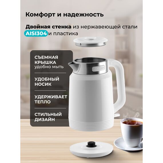Чайник имеет двойные стенки из нержавеющей стали AISI 304 и пищевого пластика. Теплоизолирующий зазор (воздушная подушка) создает эффект термоса,