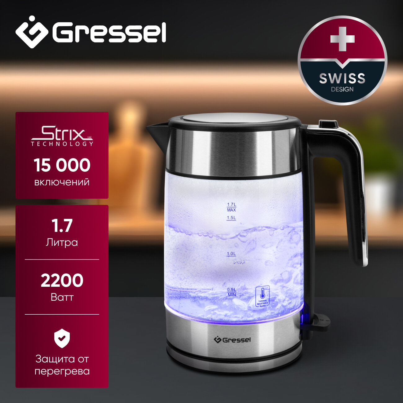 Электрический чайник Gressel GRK-1105 обладает всеми необходимыми функциями, обеспечивая комфортное использование.