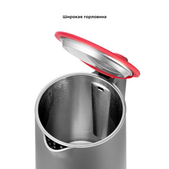 Горлышко большого диаметра и широко открывающаяся крышка позволяют легко наполнять водой, а также чистить чайник. Отметка максимального уровня воды располагается на внутренней поверхности прибора. Изнутри крышка и корпус выполнены из нержавеющей стали.