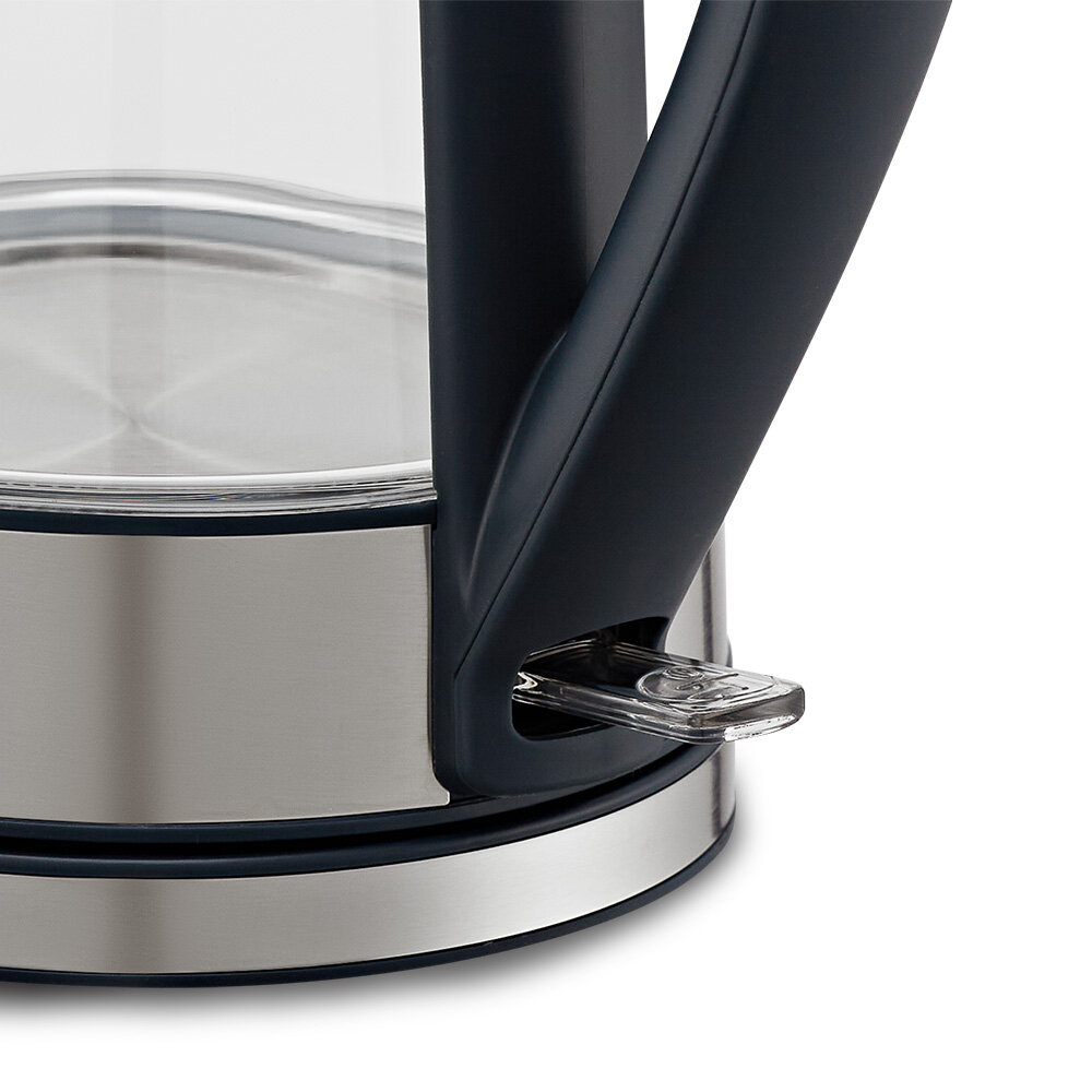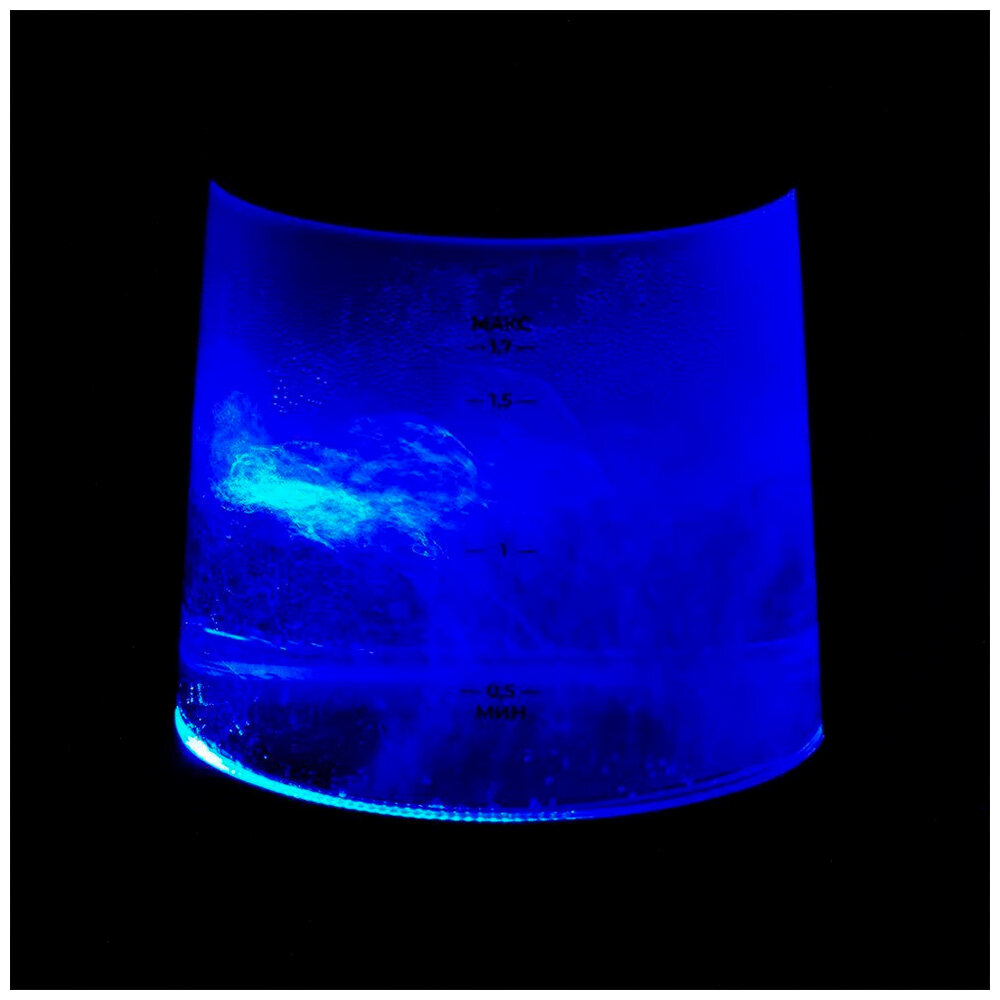 При включении чайника по периметру дна загорается синяя подсветка, которая является индикатором работы и одновременно художественно подсвечивает кипящую воду.