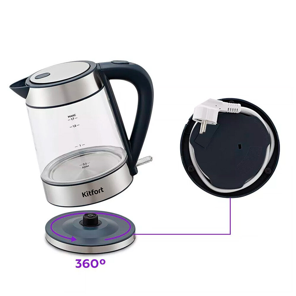 Подставка с центральным контактом даёт возможность располагать на ней чайник в любом положении, обеспечивая вращение на 360°. Снизу имеется отсек для хранения шнура, в который можно смотать излишки шнура электропитания, чтобы он не мешал на столе.