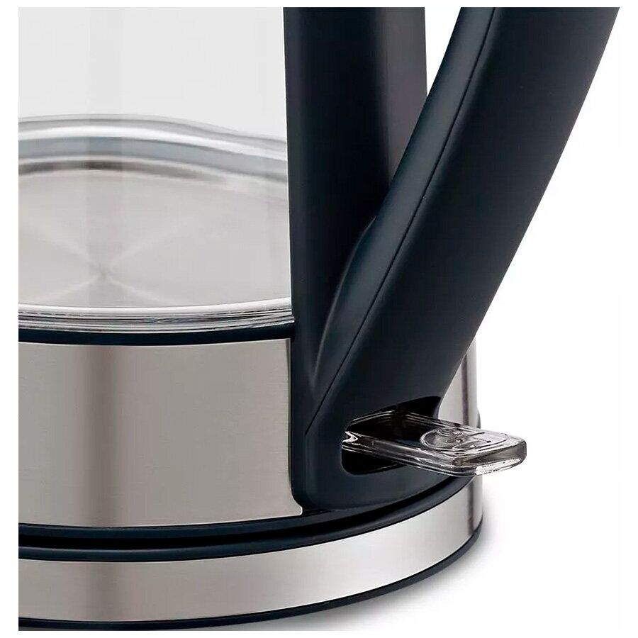 Чайник за раз может вскипятить до 1,7 л воды. Ручка пластиковая, с внутренней стороны имеет приятную шершавую поверхность. Она не нагревается и удобно лежит в руке. Нагревательный элемент закрыт пластиной. Это снижает шум при кипячении и упрощает уход.