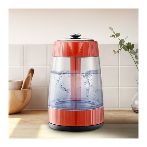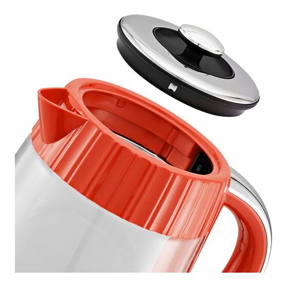 Корпус чайника выполнен из сочетания стекла и пластика.Ручка чайника сделана из пластика, она не нагревается и удобно лежит в руке. Кнопка включения расположена под ручкой. При включении загорается индикатор, встроенный в корпус.