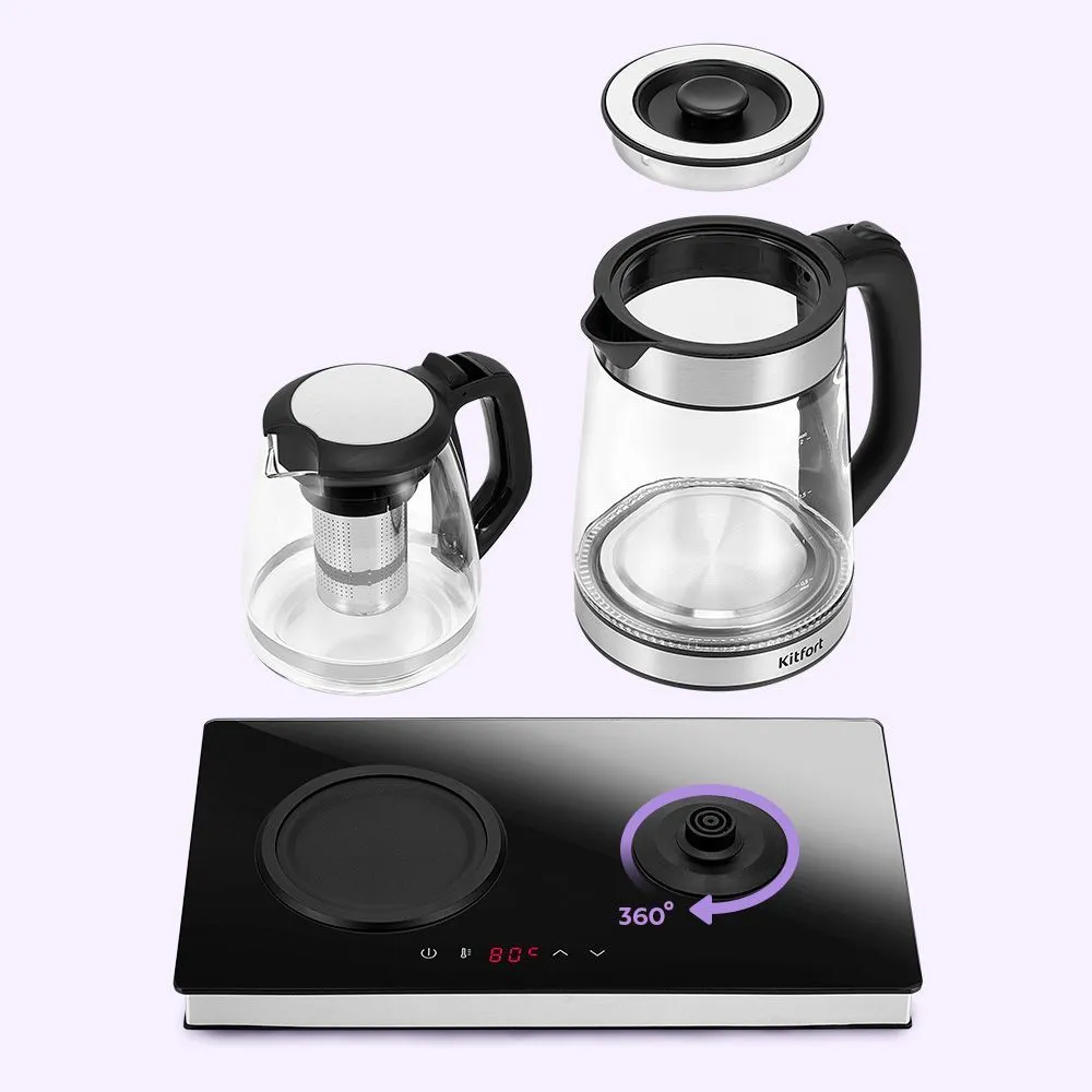 Конструкция чайника: Заварочный чайник, Дисплей, Вращение подставки на 360°, Светоиндикатор работы