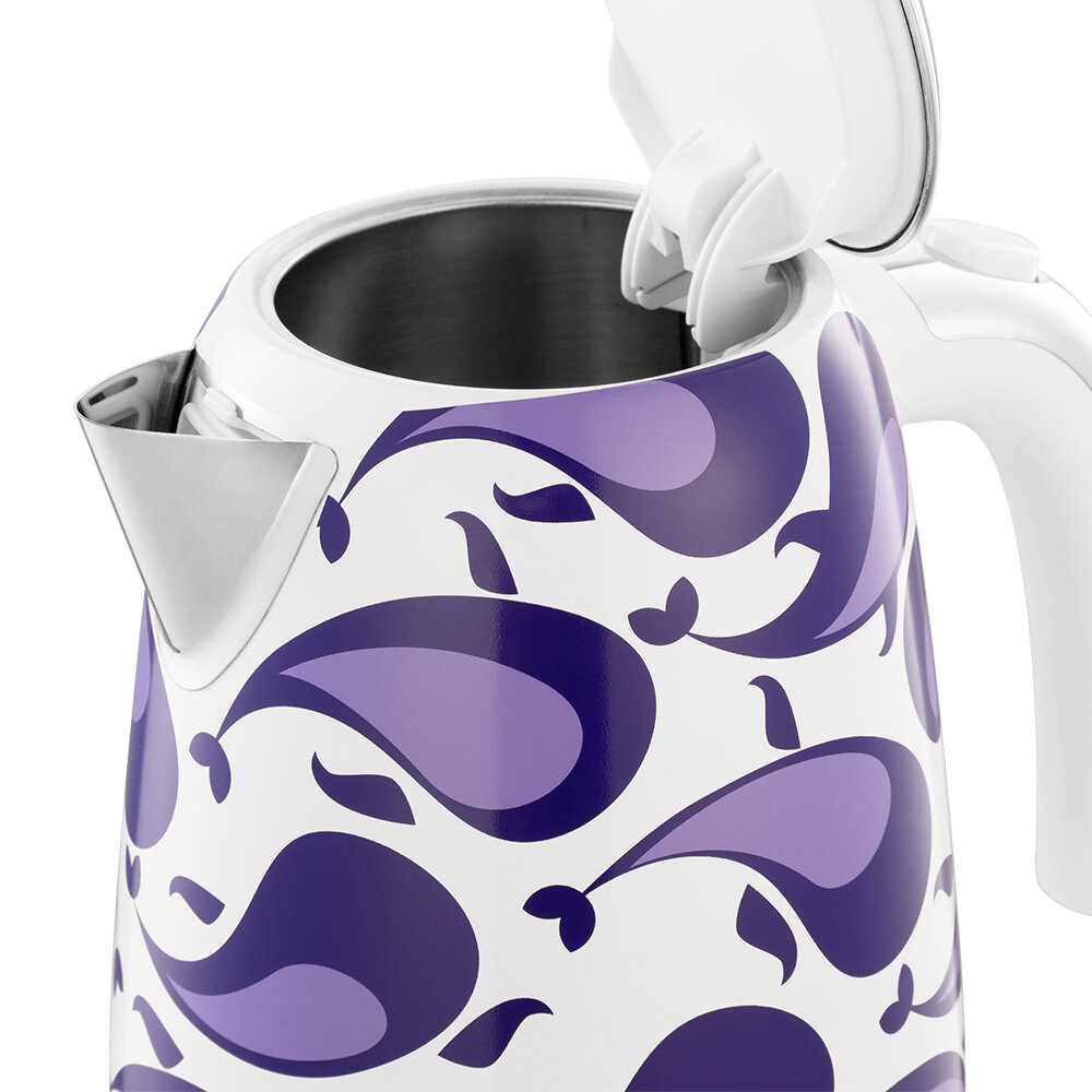 Чайник обладает широким горлышком, что делает его очень удобным для мытья. Кнопка, открывающая крышку, расположена на ручке чайника. Ручка чайника выполнена из пластика, что делает её безопасной и удобной в использовании.