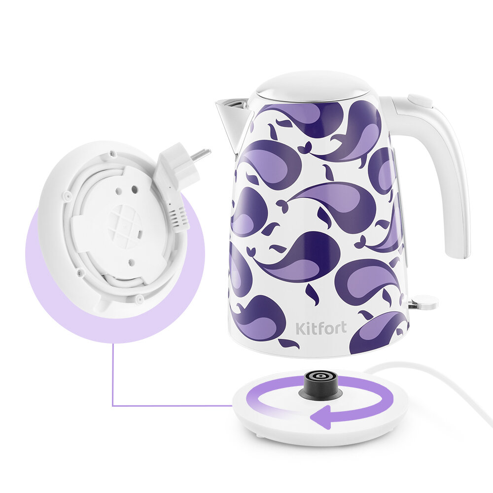 Подставка с центральным контактом позволяет разместить чайник в любом положении, обеспечивая возможность вращения на 360 градусов. В нижней части подставки есть отсек для хранения шнура, в который можно убрать излишки кабеля питания.