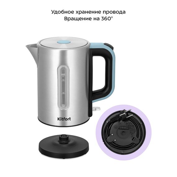 Подставка с центральным контактом даёт возможность располагать на ней чайник в любом положении, обеспечивая вращение на 360°. Снизу имеется отсек для хранения шнура, в который можно смотать излишки шнура электропитания, чтобы он не мешал на столе.
