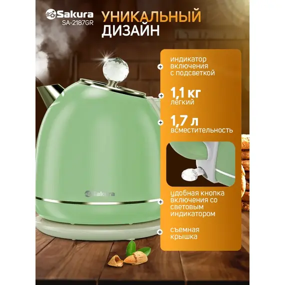 Конструкция чайника: Вращение подставки на 360°, Двухслойный корпус, Индикатор уровня воды, Отсек для шнура, Ретро-стиль, Светоиндикатор работы