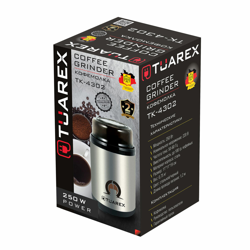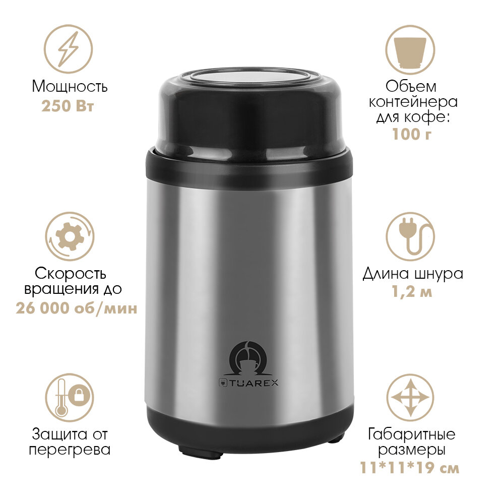 Вместительность: до 100 гр. кофейных, Эргономичный дизайн, Низкий уровень шума и вибрации, Материал ножей - нержавеющая сталь, Скорость вращения до 26 000 об/мин, Защита от перегрева, Нескользящие ножки