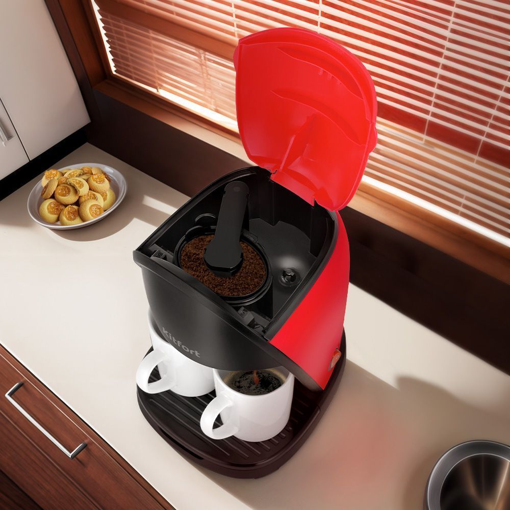 Капельная кофеварка КТ-7188 готовит ароматный чёрный кофе из молотого кофе одним нажатием кнопки.