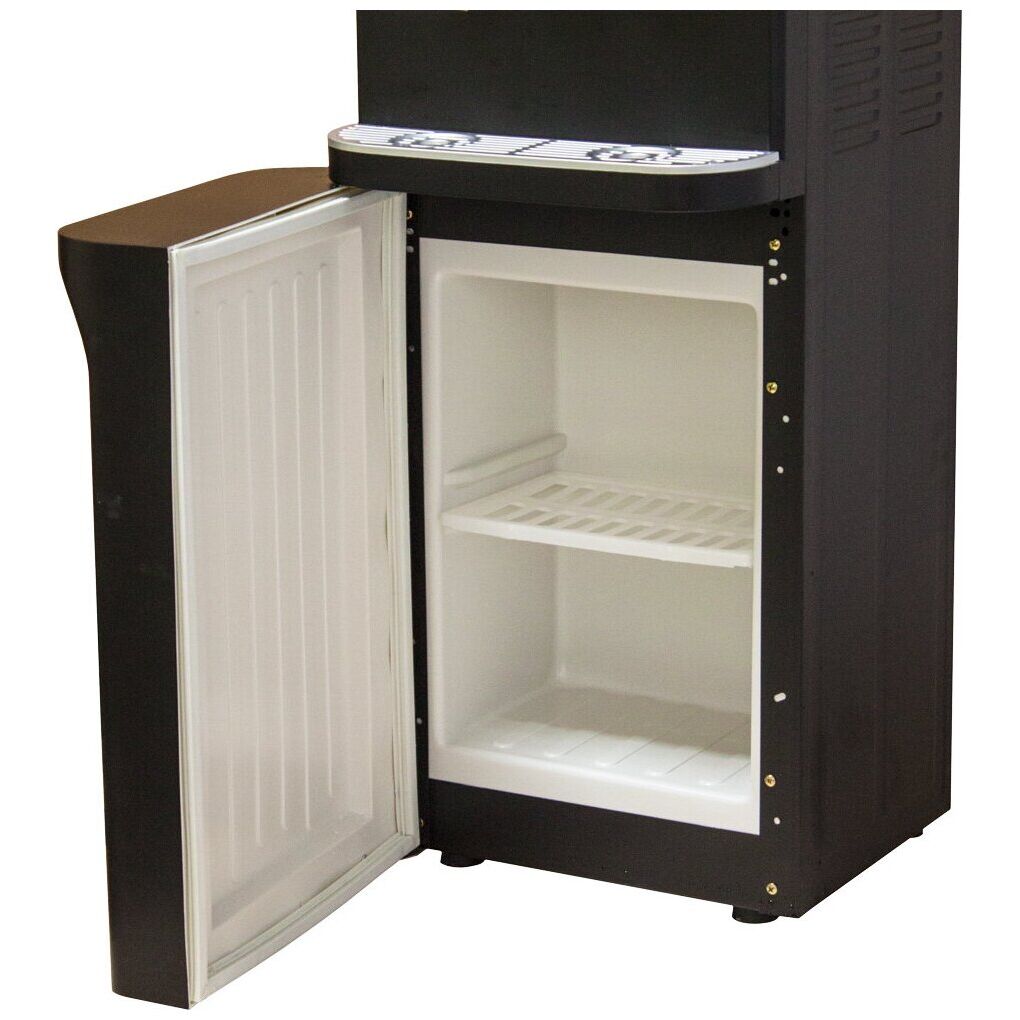 Напольный кулер для воды с нагревом, охлаждением электронного типа и небольшим шкафчиком в черном матовом корпусе из стали.