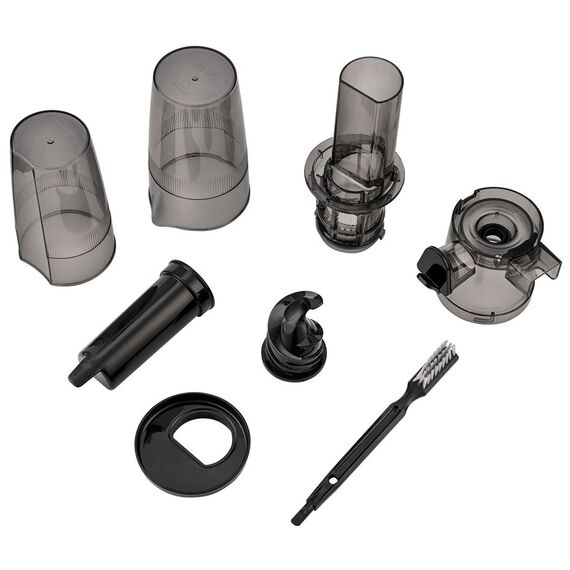 Все комплектующие соковыжималки выполнены из надёжных материалов. Чаша, крышка и толкатель сделаны из прочной пищевой пластмассы. Фильтр выполнен из нержавеющей стали, а шнек отлит из ультрапрочного пластика.