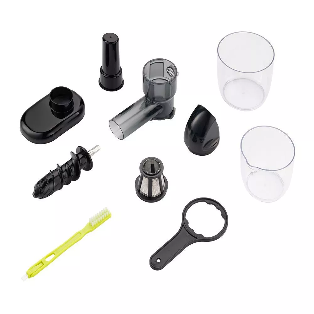 Соковыжималка разбирается за считанные секунды. Все съёмные части легко моются. А в комплекте имеется удобная щёточка для удаления остатков мякоти из отверстий сетки фильтра.
