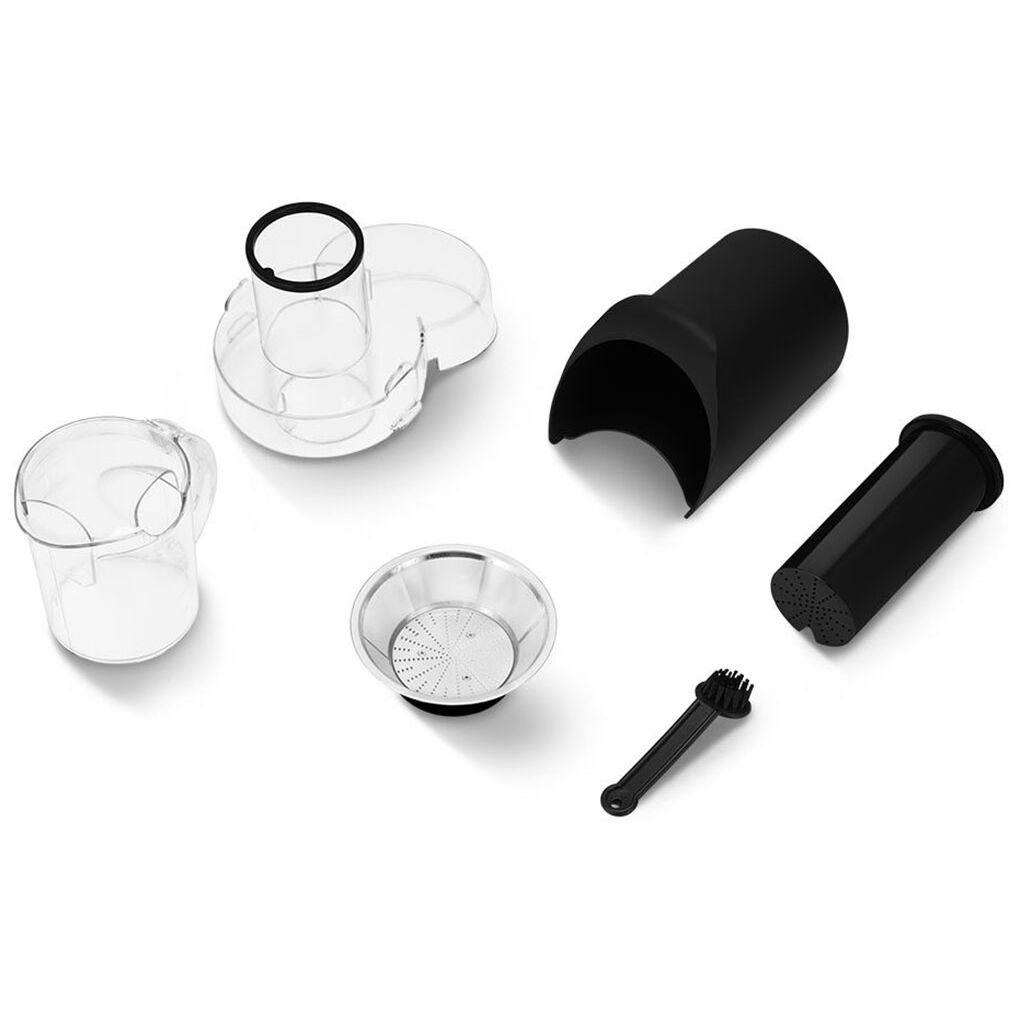 В комплект к самой соковыжималке входят щелевой фильтр, отделяющий сок от пенки, щётка для чистки, контейнер для жмыха, контейнер для сока, толкатель и чаша с патрубком для выхода сока.