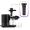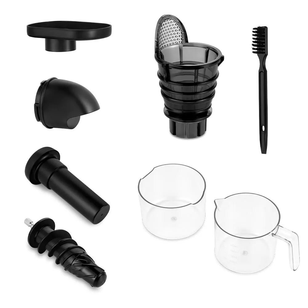 В комплекте предусмотрены толкатель для безопасного проталкивания продуктов, прозрачные контейнеры для сока (0,5 л) и жмыха (0,5 л), загрузочный лоток, фильтр. Для мытья фильтра в комплекте к соковыжималке прилагается щетка с жестким ворсом.