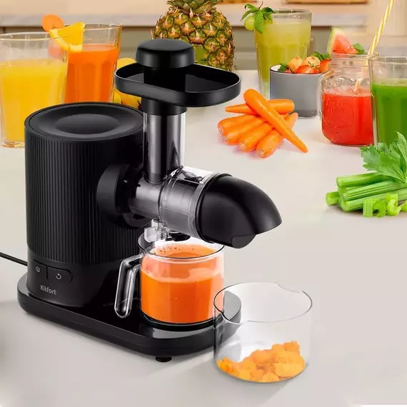 Шнековая соковыжималка КТ-1139 позволяет отжимать максимально возможное количество сока из фруктов, большинства овощей и зелени с сохранением всех их полезных компонентов. В соковыжималке можно приготовить сок с мякотью или без, фруктовый сорбет.
