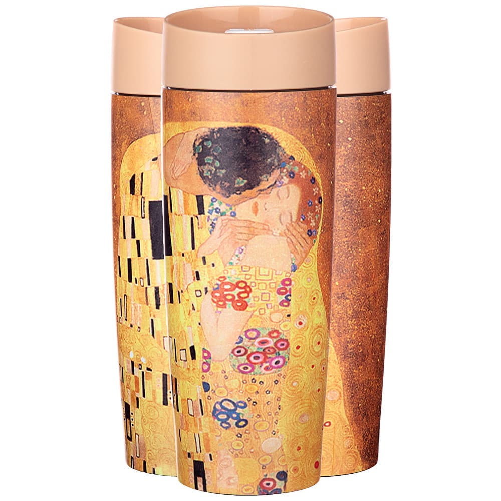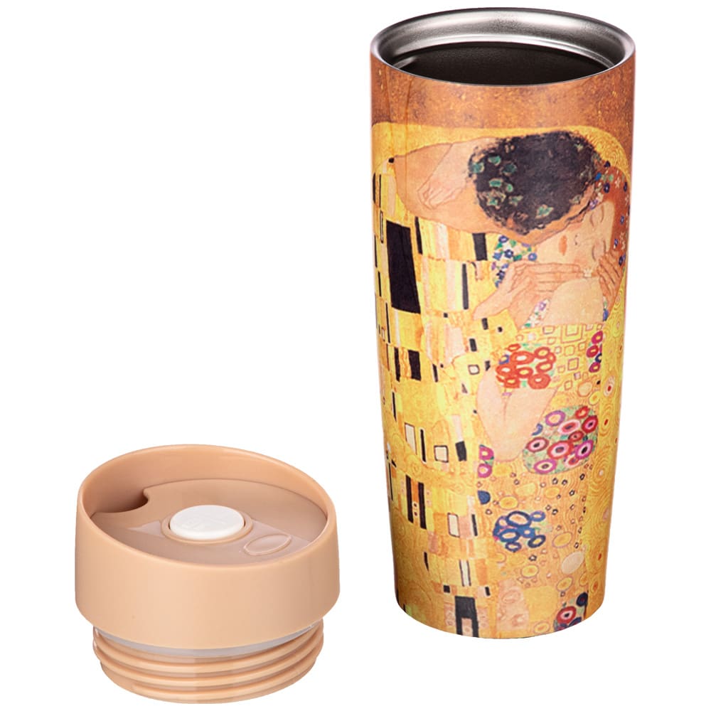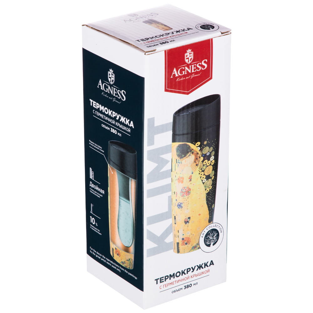 Термокружка AGNESS - незаменимый помощник в повседневной жизни. Будь это дальняя поездка, обычная прогулка или просто рабочий день в офисе - любимый напиток всегда с собой. Декор по мотивам картин Г.Климта. Двойные стенки из нержавеющей стали, благодаря технологии вакуумной термоизоляции, сохраняют напитки холодными или горячими в течение долгого времени. Дополнительная медная прослойкой между 2-мя стенками, увеличивает термоизоляцию на 10%. Герметичная крышка с кнопкой-стоппером. Используя кнопку стоппер Вы легко можете открыть термокружку одной рукой, что особенно удобно в дороге. Термокружку AGNESS удобно брать с собой, она легко поместиться в сумку или рюкзак.