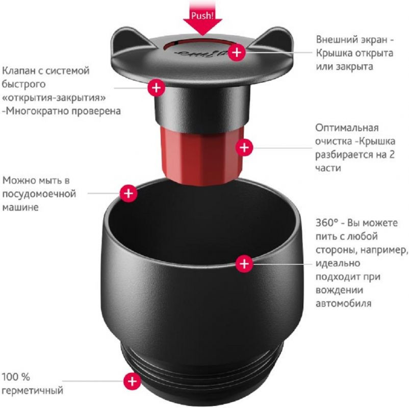 Описание: 100 % герметичная термокружка с поясом Soft Touch. Открывается простым нажатием кнопки. Можно пить с любой стороны. Пробка разбирается и превосходно моется. Сохранение температуры холодных напитков - до 8 ч, горячих - до 4 ч.