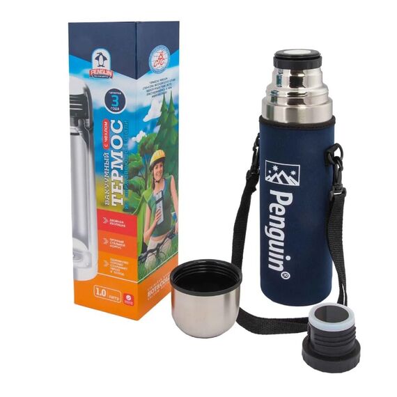 Термос с узким горлом, объем 1л, с двумя пробками: пробка с кнопкой (для удобства выливания жидкости) и глухая пробка (для более длительного сохранения температуры). Термос имеет неопреновый чехол, который обеспечивает защиту термоса от ударов и падений и добавляет 3-4 градуса к температурным показателям. Термос изготовлен из первоклассной нержавеющей стали. Все пластмассовые части сделаны из первичной пластмассы, не имеющей истории переработки.
