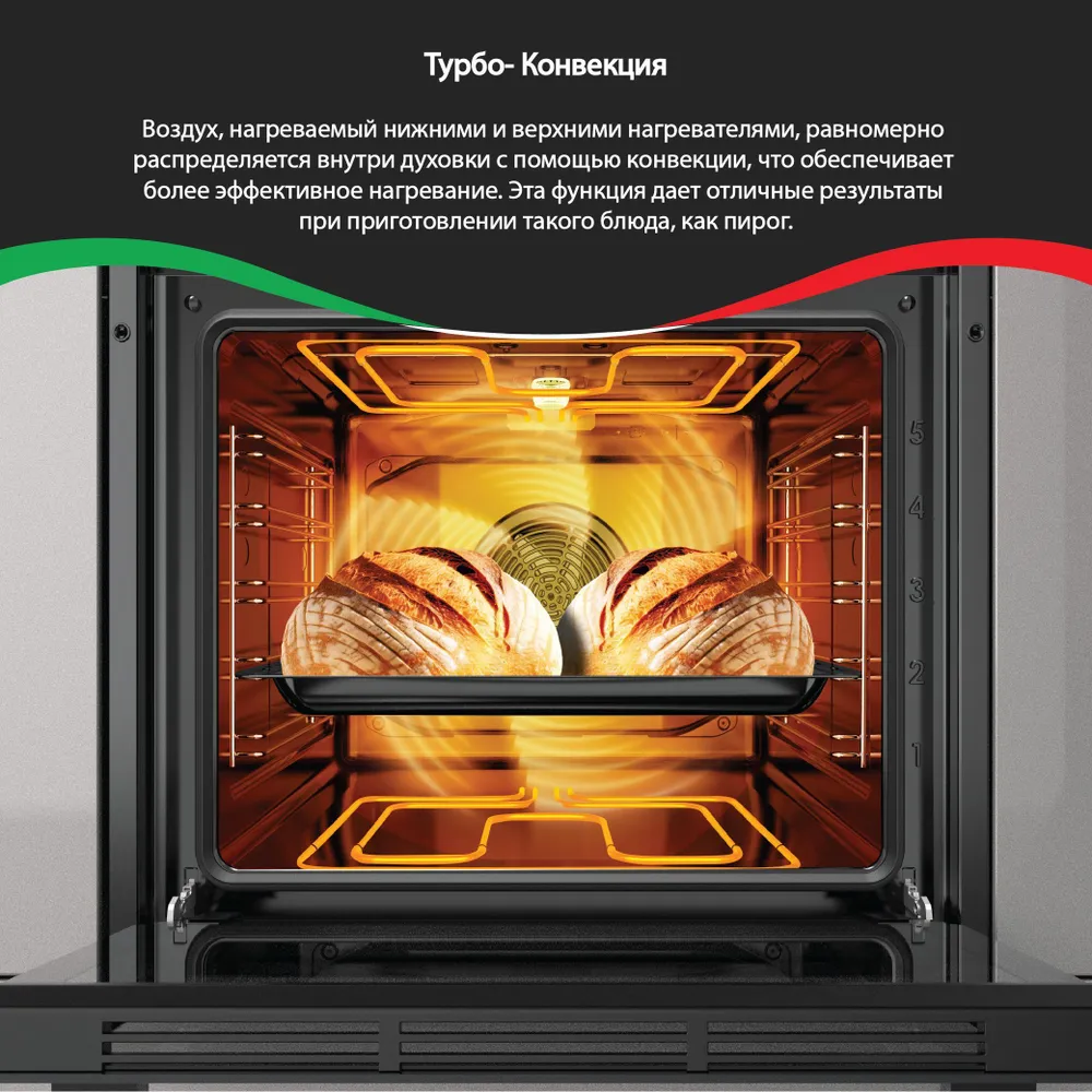 Режимы работы: Верхний + нижний нагрев, Верхний нагрев, Нижний нагрев, Гриль, Гриль + конвекция, Верхний + нижний нагрев + конвекция, Турбо режим, Конвекция