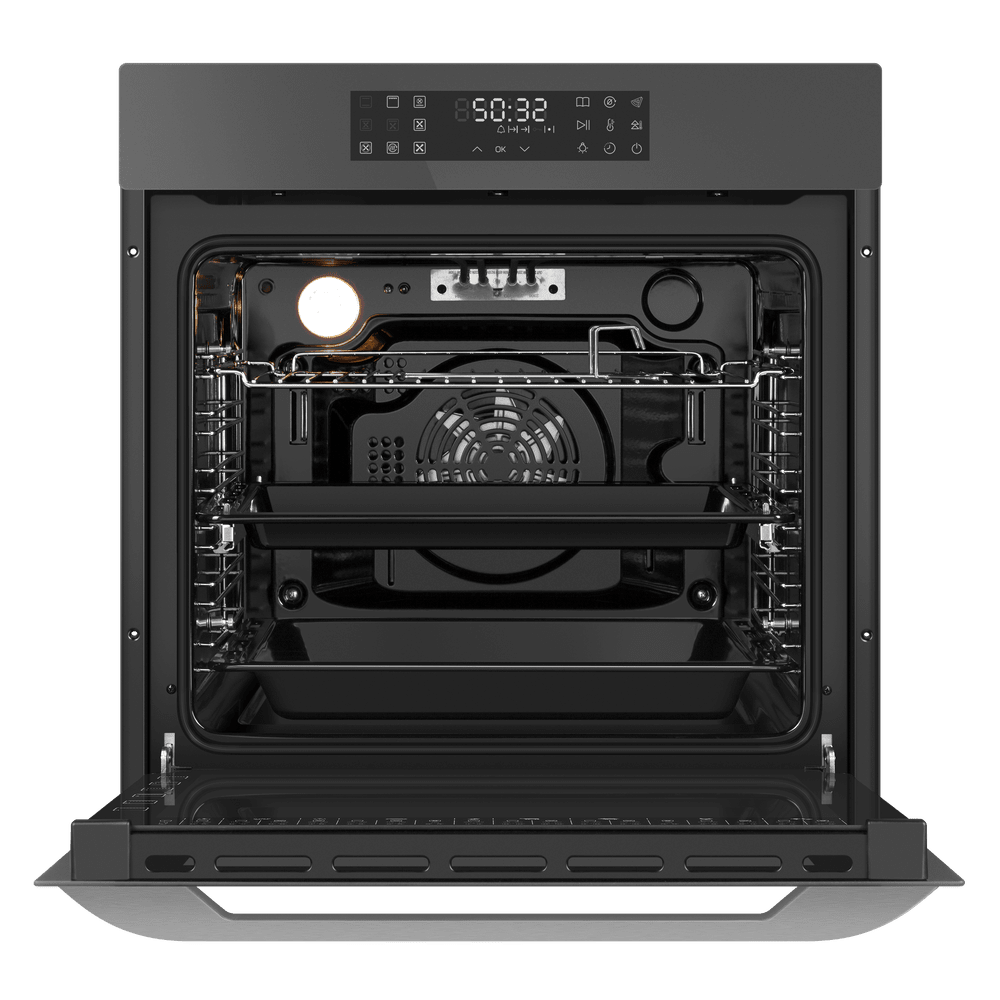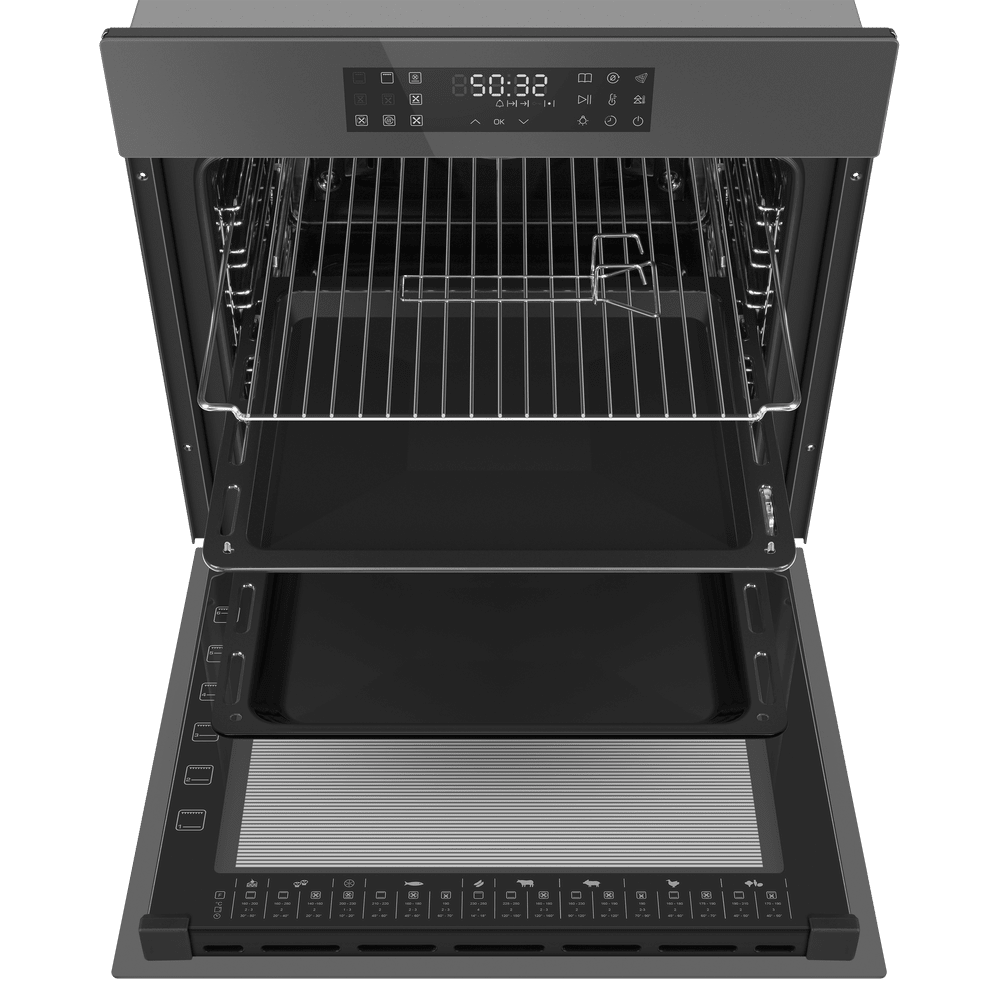 Объем 76 л при стандартных размерах 60 см позволяет готовить одновременно несколько блюд, разместив решетку или противень на одном из 6 уровней боковых направляющих. Два уровня оснащены удобными телескопическими направляющими. Внутреннее покрытие камеры выполнено из специальной легкоочищающейся эмали черного цвета.