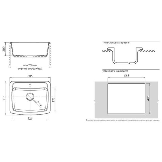В связи с особенностями литьевого производства размеры изделий могут варьироваться, поэтому вырез в столешнице рекомендуется делать непосредственно с изделия.