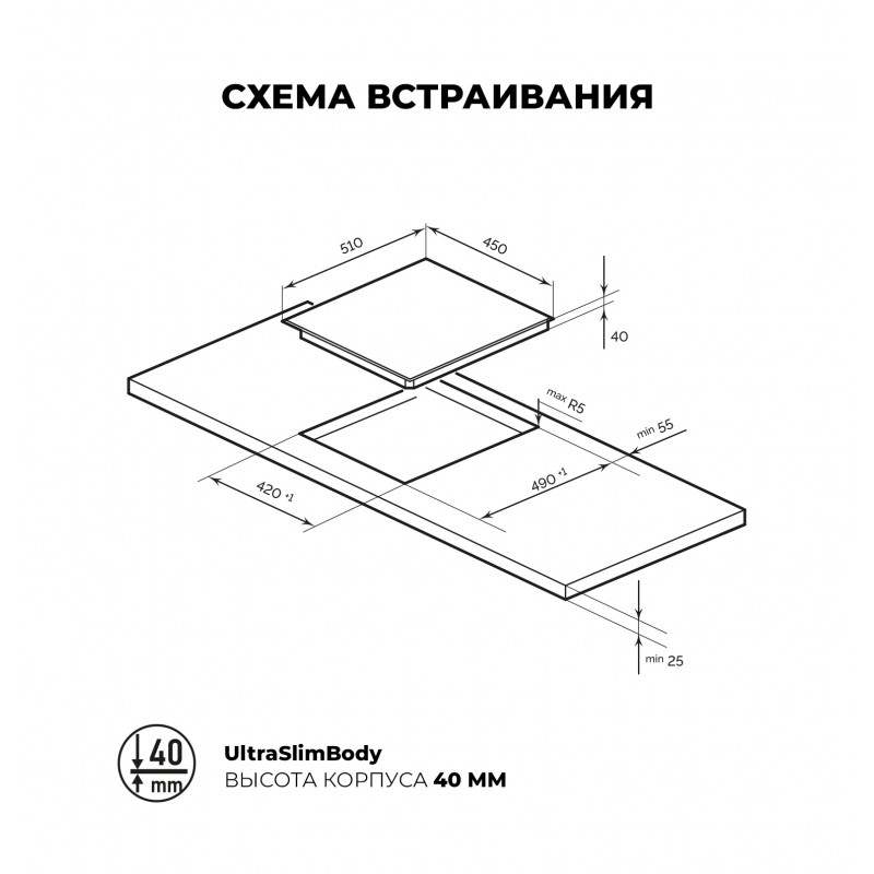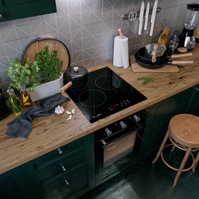 защитное отключение конфорок, индикатор остаточного тепла, кнопка блокировки панели
