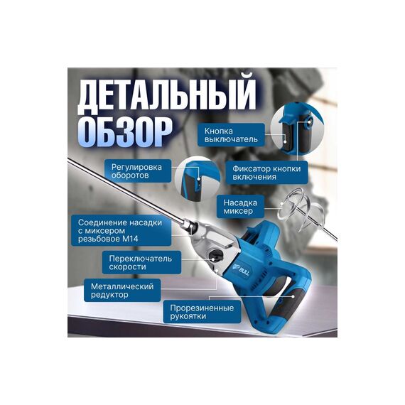 Миксер строительный BULL BM 1416 (0319102) - это надежный профессиональный инструмент, подходящий для размешивания красок, лаков, клеев, строительных растворов. Имеет прорезиненные накладки на рукоятках, что позволяет уверено держать инструмент. Наличие 2-х скоростного редуктора предотвращает разбрызгивание при размешивании материала различной вязкости. Повышенная твердость шестерен делает инструмент надежнее и выносливее к интенсивным нагрузкам. Для более точной настройки скорости имеется удобная регулировка оборотов. Кроме того, миксер оснащен функцией защиты от перегрузки, что поможет значительно продлить срок службы инструмента. Диаметр насадки: 140 мм. Общая длина насадки: 560 мм.