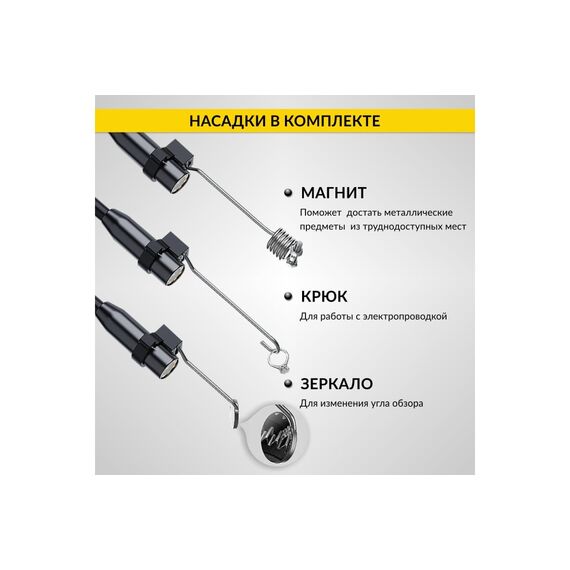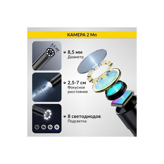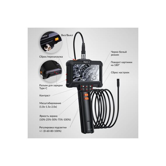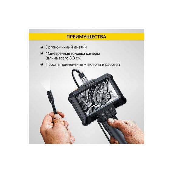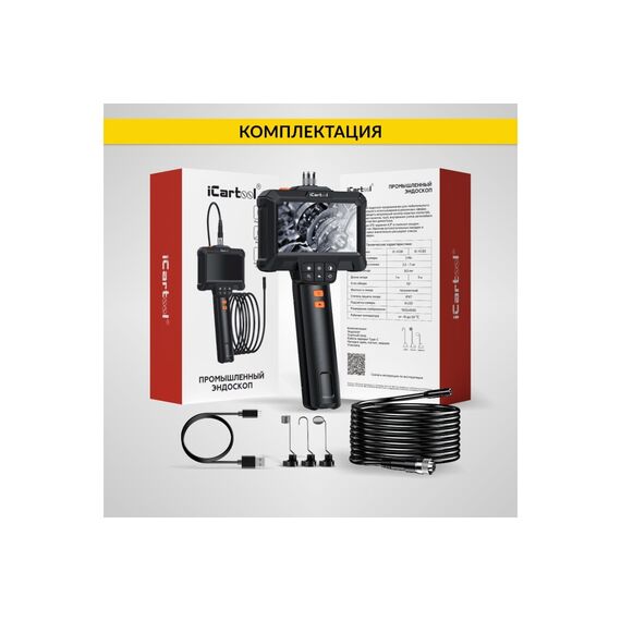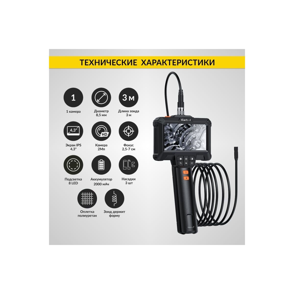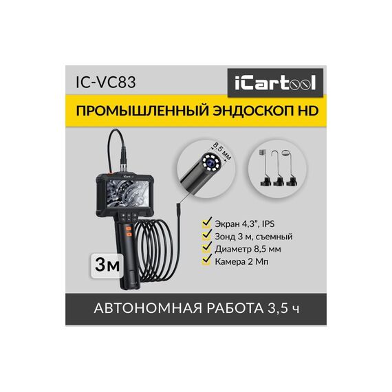 Портативный промышленный эндоскоп iCartool IC-VC83 - оснащен IPS-экраном 4,3 с широким углом обзора и камерой 2 Мп. Камера имеет диаметр 8,5 мм и длину всего 3,3 см, благодаря чему достигается максимальная маневренность при прохождении узких изогнутых участков. Зонд эндоскопа полужесткий, хорошо держит форму, имеет длину 3 м и защищен от попадания влаги. Для работы в плохо освещенных местах предусмотрена регулируемая LED подсветка с 3 режимами яркости. Встроенный аккумулятор поддерживает работу до 3,5 часов. В комплект входит USB-кабель для зарядки. Наличие вспомогательных насадок в комплекте (крюк, магнит, зеркало) значительно расширяет список выполняемых задач (крюк для работы с электропроводкой, магнит для извлечения металлических предметов из труднодоступных мест, зеркало для изменения угла обзора).