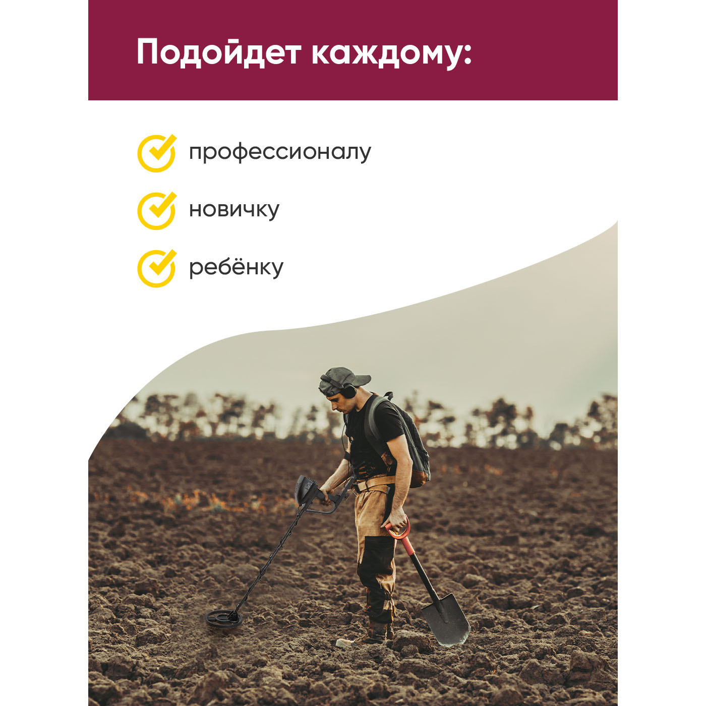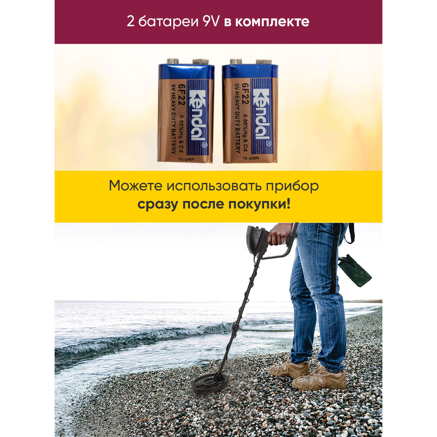 металлоискатель, батарейка 9V - 2 шт., руководство по эксплуатации.