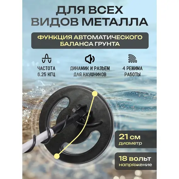 Особенности металлоискателя: Влагозащищенная катушка, Встроенный динамик, Дискриминатор, Индикация низкого заряда, Настройка чувствительности, Подлокотник, Разъем для наушников, Регулировка громкости, Режим Pin-Point, Тональная идентификация