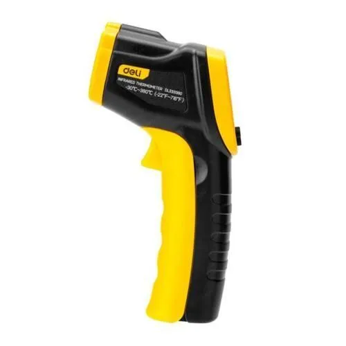 Инфракрасный пирометр (термометр) Deli DL333380 предназначен для бесконтактного определения температуры любой поверхности. Термометр имеет небольшой вес и компактные размеры, но при этом присутствуют все необходимые функции. Прибор используется как в промышленных целях - для измерения температуры в строительстве и ЖКХ, автосервисах и пр, так и в бытовых целях - поможет измерить температуру воды или установить места, в которых окна пропускают холод. Позволяет измерять температуру как в градусах Цельсия, так и в Фаренгейтах в широком диапазоне от -30 до 380℃ и от -22 до 716℉ Практически мгновенное измерение - всего 0,5 сек, а Оптическое разрешение 8:1 позволяет работать на относительно безопасном для пользователя расстоянии. Все полученные результаты отображаются на ЖК-дисплее с яркой светодиодной подсветкой, облегчающей работу в слабоосвещенных местах. Функция DATA HOLD позволяет фиксировать данные на экране, что обеспечивает удобство при замерах в ограниченном пространстве. Работает на двух мизинчиковых батарейках ААА 1,5В (водят в комплект), что позволит легко и быстро заменить элементы питания в случае необходимости, а закреплённая крышка батарейного отсека не потеряется.