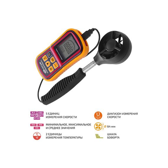 МЕГЕОН 11001 является новинкой в модельном ряде цифровый термоанемометров нашего производства.К одним из наиболее важных приимуществ можно отнести высокую чувствительность, скорость отображения данных и телескопическую рукоятку датчика. Корпус прибора защищён ярким износостойким полиуретановым холдером. Гибкие возможности настроек позволяют выбрать одну из пяти единиц измерения набегающего потока воздуха и две единицы температуры окружающей среды. Параллельно полученные результаты скорости конвертируются в данные по шкале Бофорта. Также был предусмотрен индикатор пронизывающего ветра. Помимо текущей скорости ветра мы предусмотрели возможность получения максимальных, минимальных и усреднённых значений. Все данные отображаются на большом ЖК-дисплее с яркой отключаемой светодиодной подсветкой, что позволяет применять прибор в условиях с ограниченной видимостью.