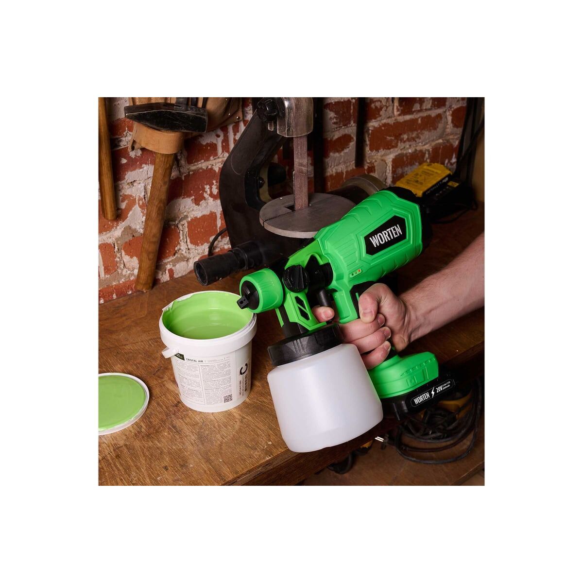 Краскопульт 2АКБ 120 W 0,8л IM КА-90000337 WORTEN подходит для окраски мебели, заборов, дверей, окон, стен, потолка, ремонта автомобиля и других целей. Подходит для покраски как небольших, так и средних поверхностей. Он оснащён встроенным компрессором и работает по принципу HVLP (High Volume Low Pressure), обеспечивая высокое качество покрытия при низком давлении воздуха. Подходит для использования как для профессионалов, так и для любителей.