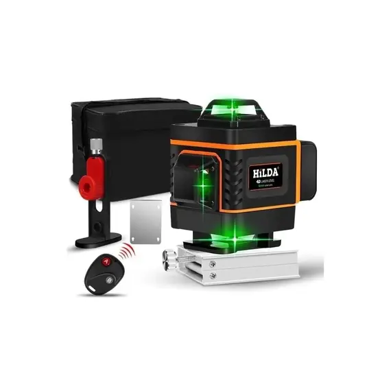 Самовыравнивающейся Лазерный уровень нивелир4Д/16 линий. У данной модели 16 линий с построением плоскостей в 360 градусов. То есть уровень имеет 4 форточки каждая из которых строит лучи в 4х направлениях( вокруг оси). Два горизонта вверху и внизу уровня (нижний луч удобен при стяжке и укладке плитки). И две вертикальные плоскости с перекрещиванием под прямым углом. (есть точка отвеса). Цвет луча зеленый. Лучи тонкие и яркие, в помещении видно даже в яркую солнечную погоду. Диапазон до 30 метров. Работает как от сенсорных кнопок, так и с пульта. Аккумулятор заряжается за 1.5- 2 часа и способен беспрерывно работать до 8 часов на одном луче.