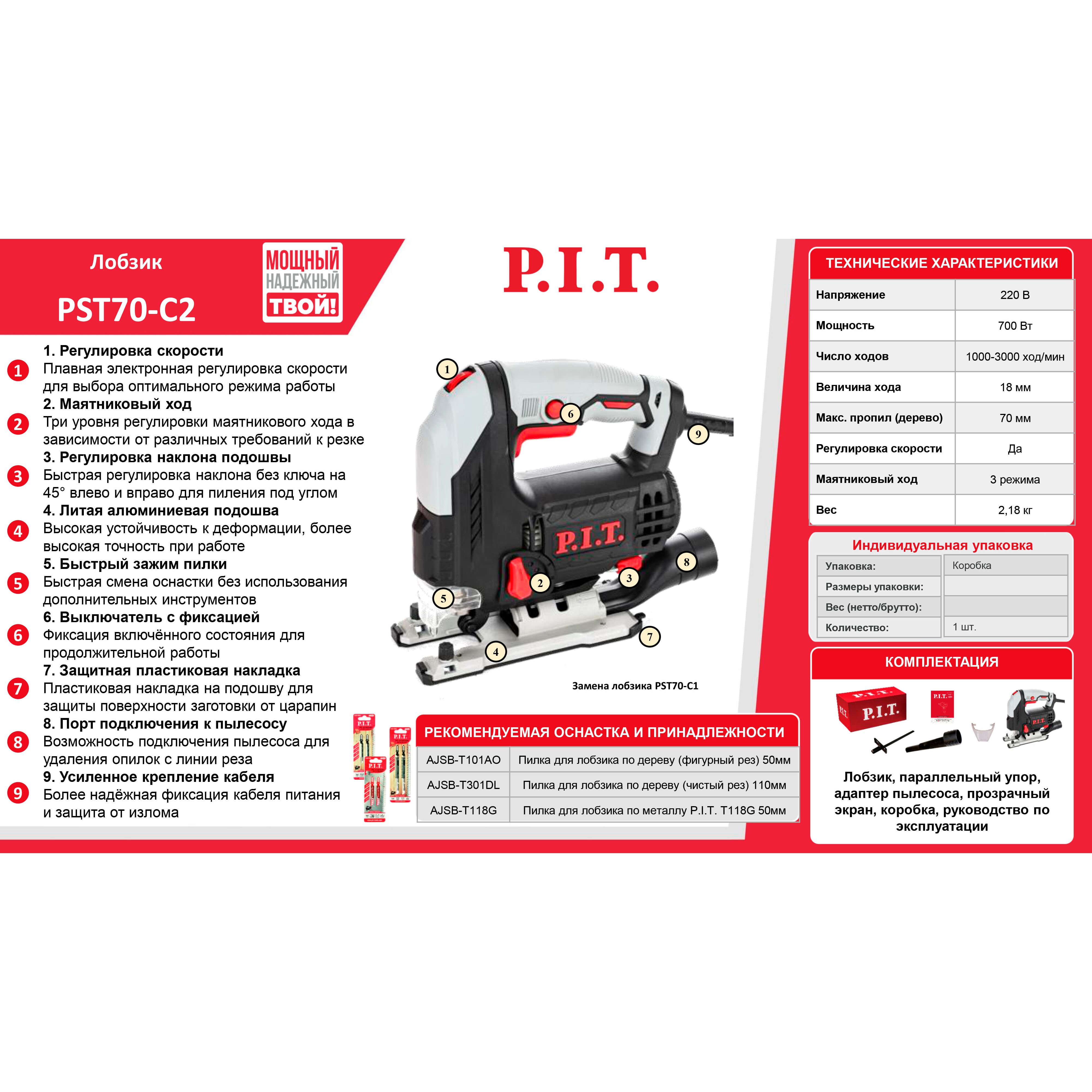 Обновлённая версия отлично зарекомендовавших себя лобзиков PIT. Обновленный дизайн, улучшенная эргономика, долгий срок службы. Электрический лобзик PST70-C2 отлично подойдет для прямых, наклонных и криволинейных распилов различных материалов: дерева, деревосодержащих композитных материалов, панелей, пластика, металла.