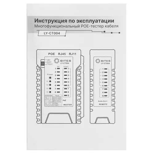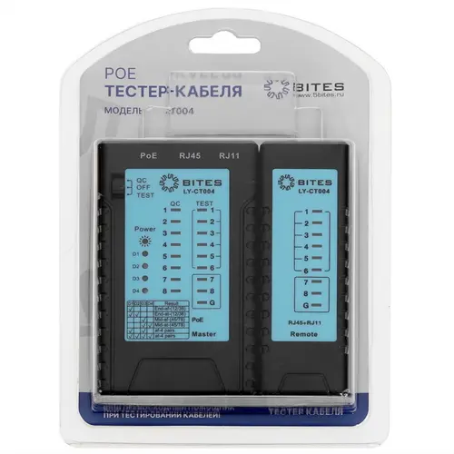 На фронтальной панели расположены обозначения и световые индикаторы. Автономная работа 5bites LY-CT004 осуществляется на основе элемента питания крона 9В. Кабельный тестер выполнен в корпусе из прочного пластика, устойчивого к ударам и другим механическим воздействиям.