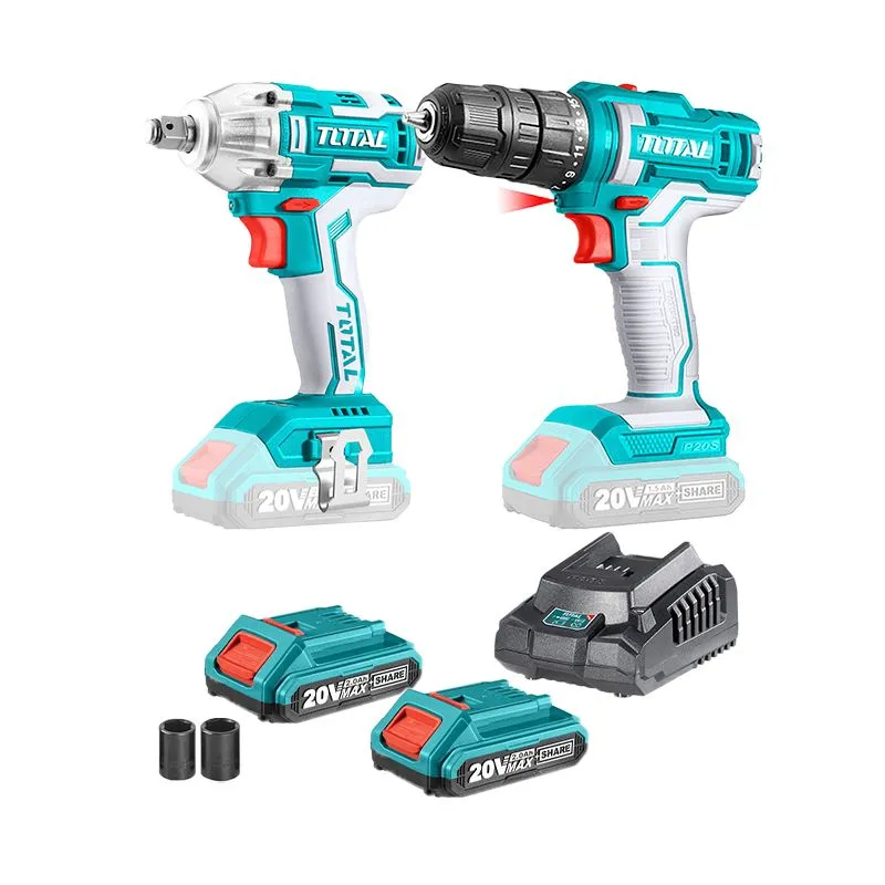 TOTAL TOSLI230702 – набор инструментов TOTAL P20S( с единым АКБ), включающих дрель-шуруповерт TDLI200528, гайковерт TIWLI2038, 2 АКБ, ЗУ и оснастку