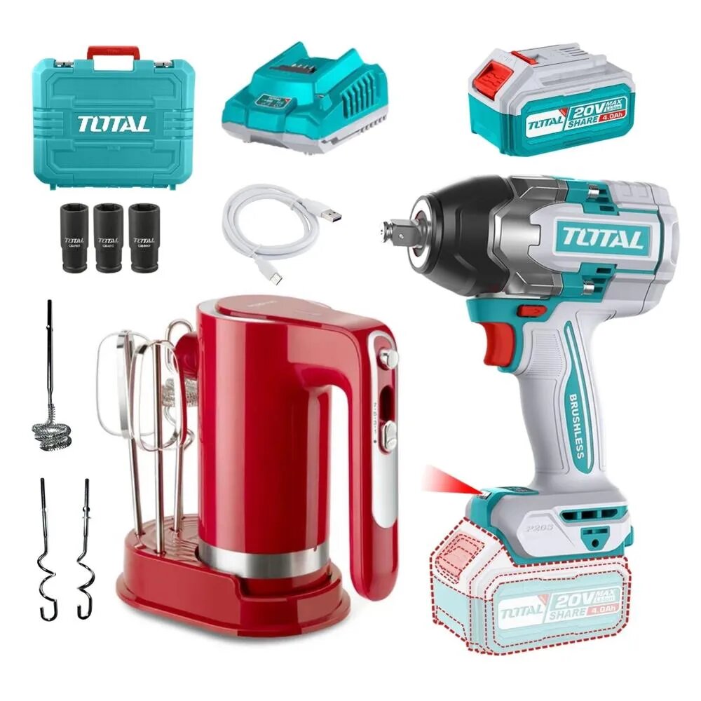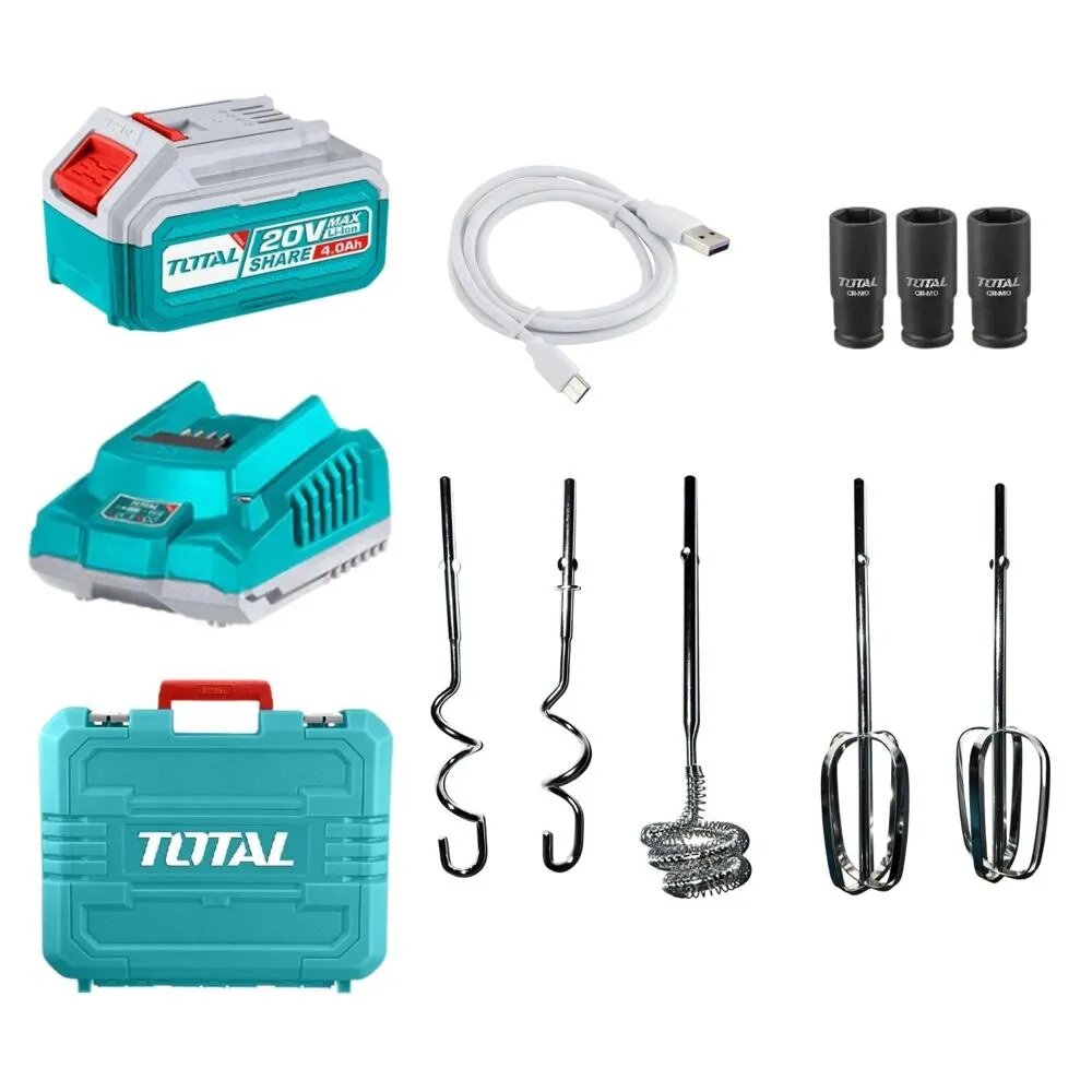 Гайковерт TOTAL TIWLI20851 - 1 шт. Аккумулятор TFBLI2002 4,0 Ач - 1 шт. Зарядное устройство TFCLI2001E - 1 шт. Торцевая головка (22, 24, 27 мм) - 3 шт. Миксер TMK006H - 1 шт. Венчики - 2 шт. Вспениватесь молока - 1 шт. Кейс.