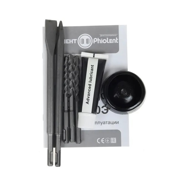 дополнительная рукоятка, кейс, ключ, смазка, пыльник, зубило, долото, бур (8, 10 ,12 мм)