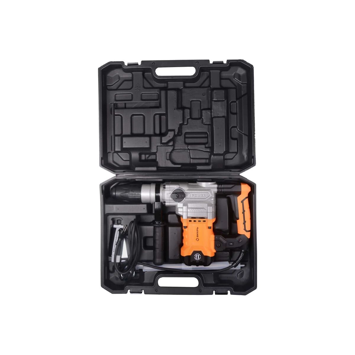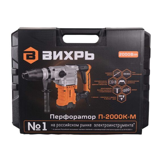 Модель Вихрь П-2000к-м SDS-Max относится к профессиональному сегменту. В ней реализована возможность установки углового положения, антивибрационная система и имеется дополнительная ручка, а также тип хвостовика - sds-max, что значительно повышает эффективность работы и облегчает её эксплуатацию. Перфоратор питается от сети 220 В, 50 Гц. В комплекте кабель питания длиной 2 м и прочный кейс для инструмента и оснастки. Вес инструмента – 7.5 кг.