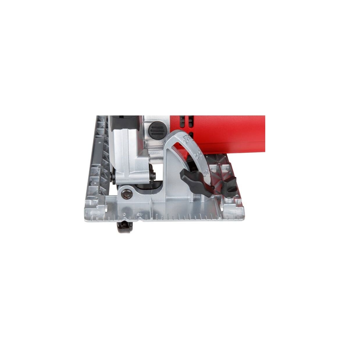 Можно регулировать глубину и угол наклона пропила. Модель оснащена широкой алюминиевой платформой и прорезиненной рукояткой. Количество зубьев: 24 шт.