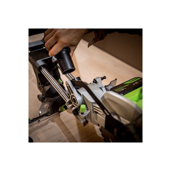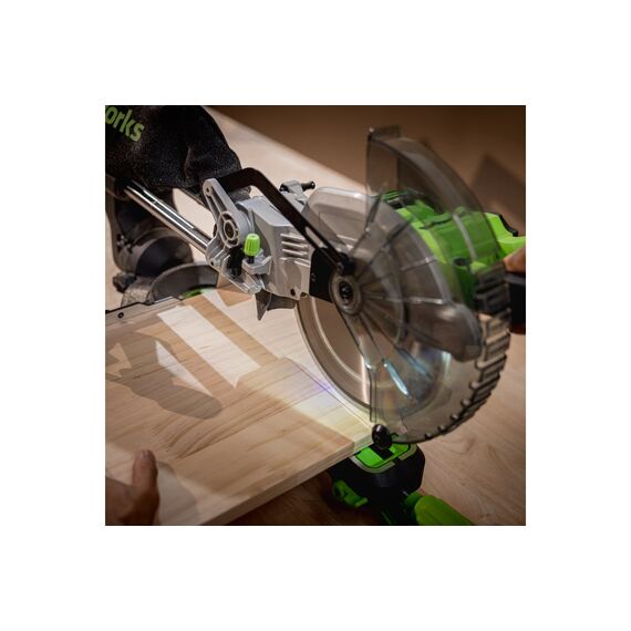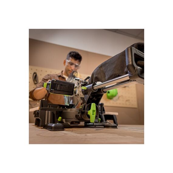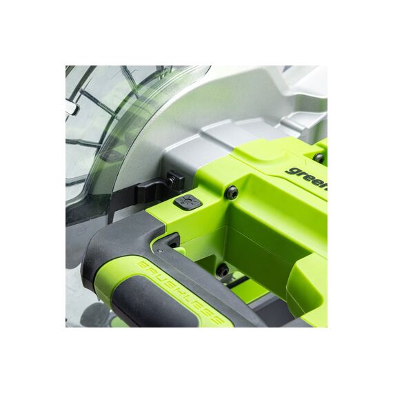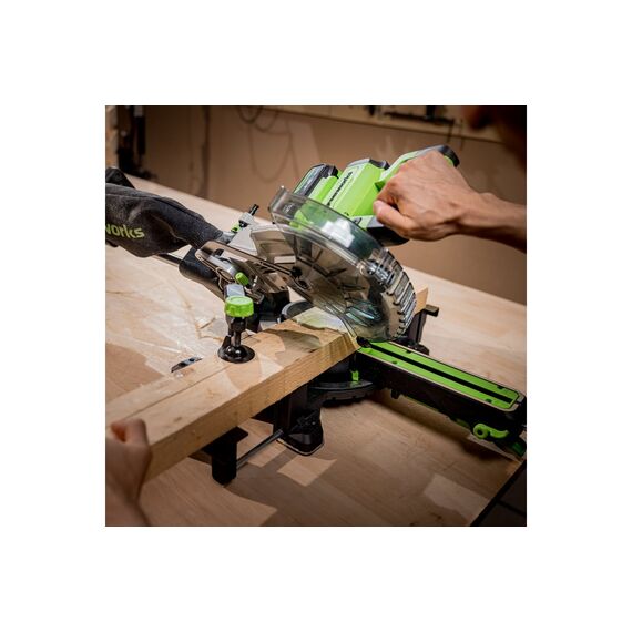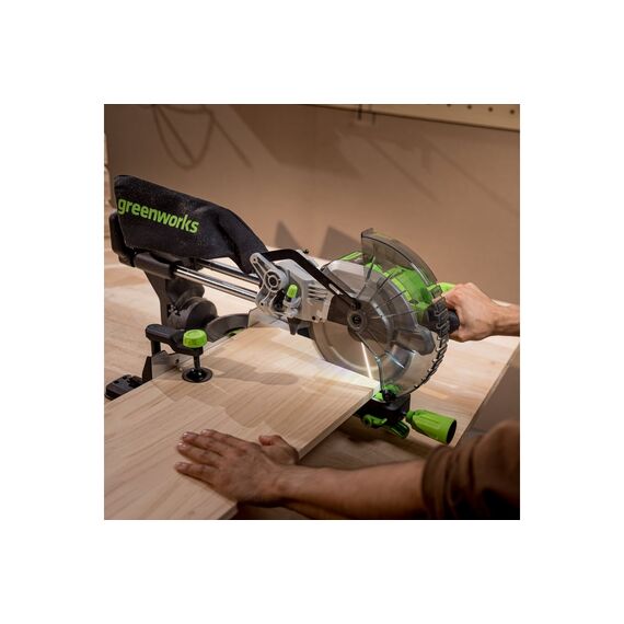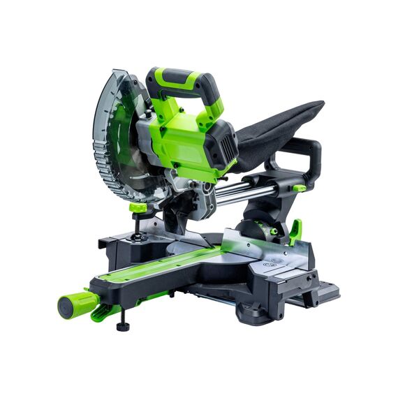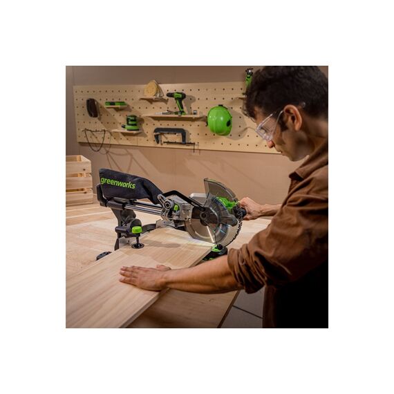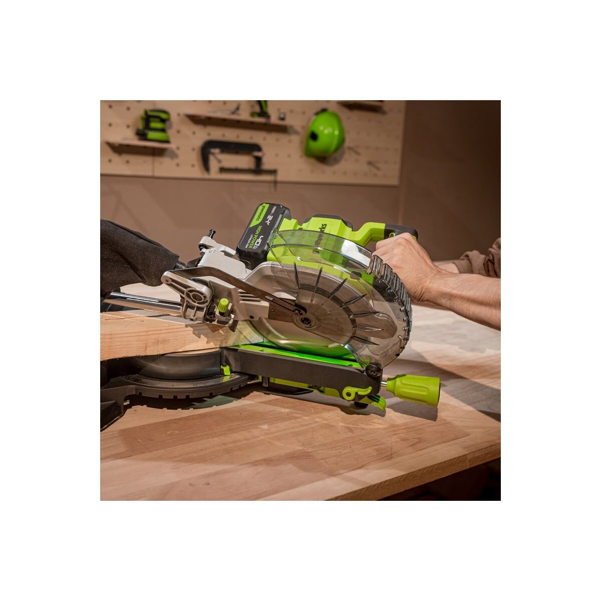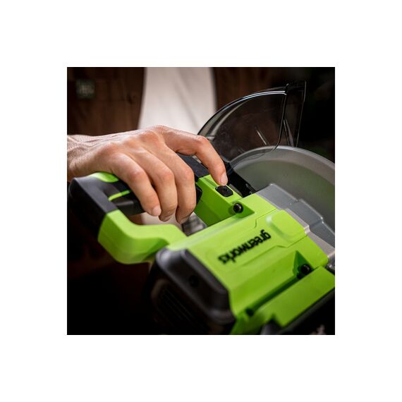 Мобильная производительная аккумуляторная торцовочная пила Greenworks GD24MS216 с функцией протяжки – максимально удобная в эксплуатации.