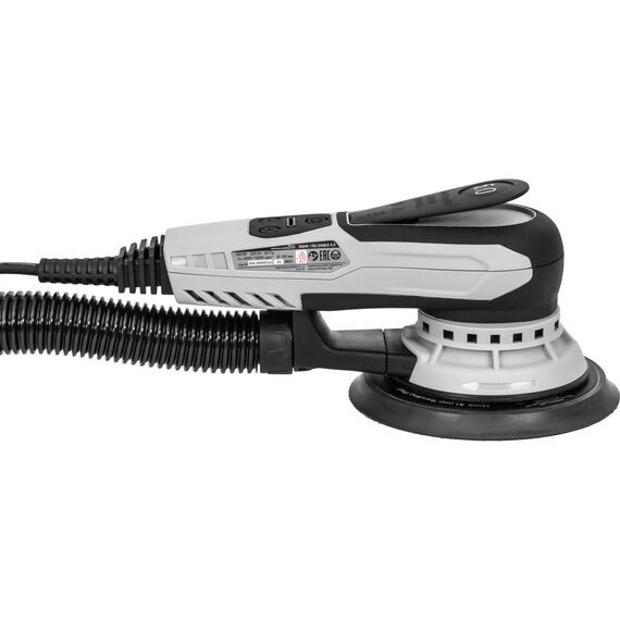 Эксцентриковые профессиональные шлифмашины ИНТЕРСКОЛ ЭШМ-150/350ВЭ оборудованы бесщеточным (вентильным) сетевым двигателем, работающим под управлением цифрового электронного блока. Повышенный коэффициент полезного действия двигателя и отсутствие редуктора обеспечивают шлифмашине высокую энергоэффективность и рекордно малый вес. В сочетании со схемой динамической балансировки это снижает массу изделия и позволяет оператору машины эффективно шлифовать длительное время не уставая. Эквивалентная мощность в пересчете на традиционную схему с коллекторным двигателем и редуктором составляет 600Вт, что достаточно практически для всех операций эксцентрикового шлифования. Продуманная конструкция пылеудаления при эксплуатации с пылесосом удаляет практически всю образующуюся при шлифовке пыль, повышая качество шлифовки и сохраняя чистоту на рабочем месте. Регулировка оборотов от 4000 об/мин до 10000 об/мин с шагом 1200 от/мин, эксцентриситет 5,0мм и тормоз тарелки обеспечивает как высокую эффективность шлифовки, так и финишное качество поверхности, потому что частицы абразива каждый раз проходят по новой траектории.