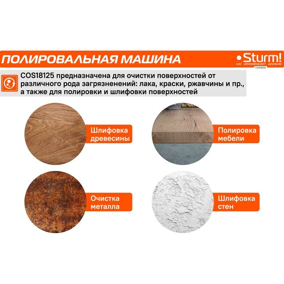 Шлифмашина COS18125 18В, 1BatterySystem, предназначена для очистки поверхностей от различного рода загрязнений: лака, краски, ржавчины и пр., а также для полировки и шлифовки поверхностей.