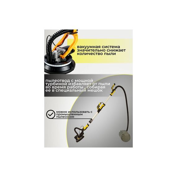Шлифмашинка WMC-S1M-DH04-230A с телескопической рукояткой от WMC Tools – надежный и удобный инструмент для выравнивания, шлифовки и полировки высоких стен и потолков. Он легкий и хорошо сбалансированный, что позволяет легко использовать его в труднодоступных местах. Мощный двигатель справится даже с твердыми поверхностями, а регулируемая скорость вращения позволяет выполнять различные задачи. Яркая светодиодная подсветка освещает рабочую зону и подчеркивает неровности поверхностей. Высококачественная застежка-липучка позволяет легко устанавливать и заменять наждачную бумагу. Длинный шнур питания и шланг для пылеотвода увеличивают рабочую зону. Телескопическую штангу можно отрегулировать под рост пользователя и задачи. Прочный корпус из высококачественного АБС-пластика защищает внутренние элементы от повреждений. Эффективная система охлаждения предотвращает перегрев и продлевает срок службы двигателя. Шестерни коробки передач изготовлены из прочной стали. Двигатель защищен от строительной пыли и коротких замыканий термостойким лаком.
