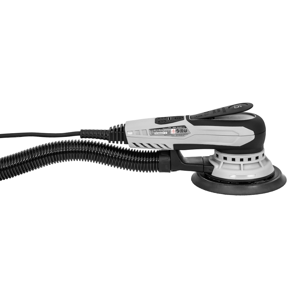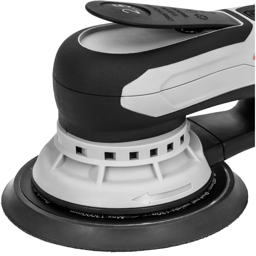 Регулировка оборотов от 4000 об/мин до 10000 об/мин с шагом 1200 от/мин, эксцентриситет 2.5 мм и тормоз тарелки обеспечивает как высокую эффективность шлифовки, так и финишное качество поверхности, потому что частицы абразива каждый раз проходят по новой траектории.