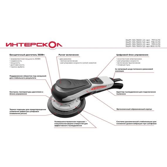 Эксцентриковые профессиональные шлифмашины ИНТЕРСКОЛ ЭШМ-125/350Э оборудованы бесщеточным (вентильным) сетевым двигателем, работающим под управлением цифрового электронного блока.