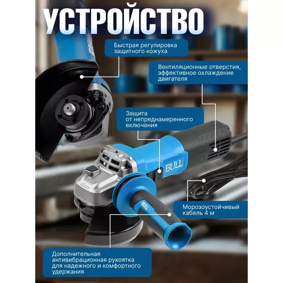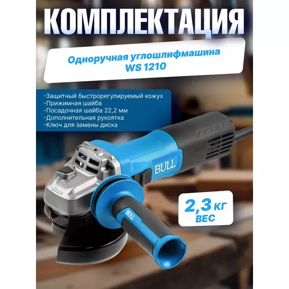 Шлифмашина угловая (болгарка) BULL WS 1210 (1333511) оснащена долговечным и производительным пылезащищенным двигателем 1000 Вт.