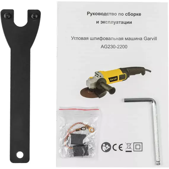 - AG230-2200 оснащена угловой дополнительной рукояткой, защитным кожухом и фланцевым ключом, что добавляет удобства и повышает безопасность использования. Шлифовальная машина подойдет профессионалам, которым необходим надежный инструмент для интенсивного использования.